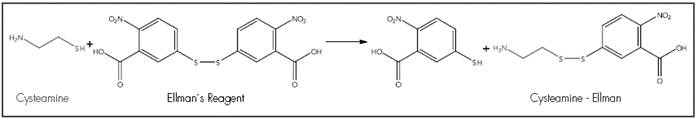 Quantification of cysteamine: A saturated solution of Ellman’s reagent (5,5’-dithiobis -(2- nitrobenzoic acid)) was prepared as a derivatizing agent 22 (Figure 1), by dissolving 29.6 mg of the powder in 10 mL of 0.018 M aqueous NaOH. Subsequently, the solution was filtered through a 0.45 μm filter.