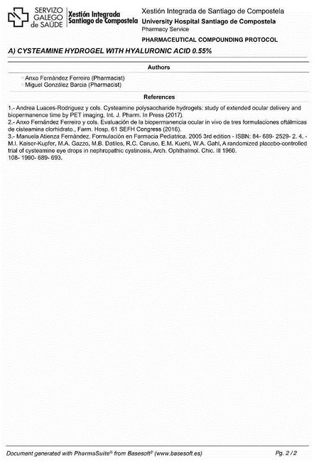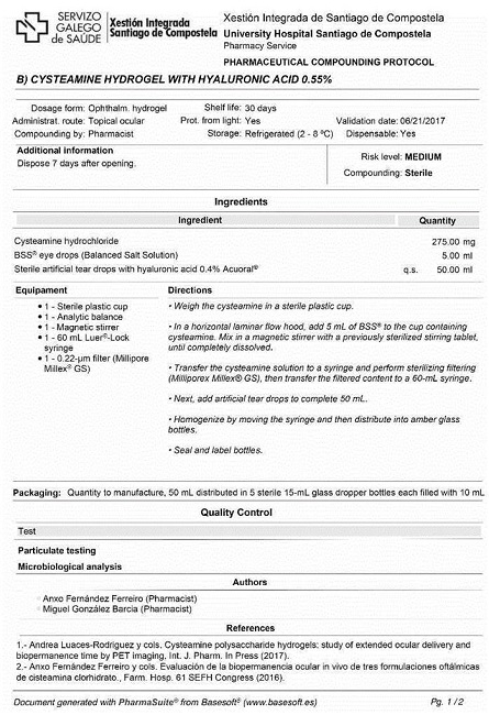 Difficult dosage schedules are the major challenge to the use of ophthalmic compounded formulations of cysteamine hydrochloride, because they require hourly instillations to reduce the amount of corneal crystals. A preclinical study has shown that the biopermanence of the hydrogel under study is similar to that of Cystadrops®(18. Quantitative PET biopermanence studies have shown that cysteamine hydrogel with hyaluronic acid has a 60-minute half-life, which is much higher than the 18-minute half-life of cysteamine eye drops typically prepared by hospital pharmacy services. In addition, more cysteamine reaches the stroma after administration of this hydrogel than reaches it with eye drops, and there are statistically significant differences in transcorneal permeation values between the two media. This hydrogel formulation achieves a controlled release of cysteamine over time, and can be prepared by pharmacy services for patients with ocular cystinosis17. Two preparation methods are presented in the supplementary materials.