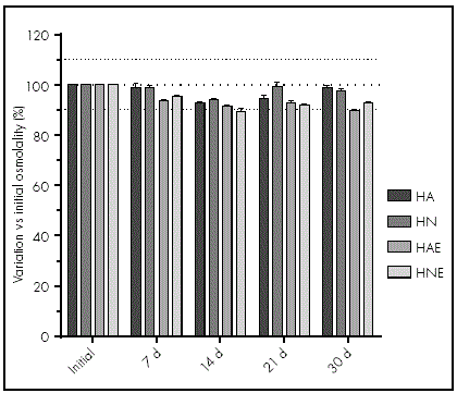 Determination of osmolality and pH: Osmolality was measured using a vapour pressure osmometer (VAPRO 5520). 10 μL of each formulation was deposited on a disk of Whatman filter paper on the chamber. pH was determined using a Crison micropH2001® pH-metre.