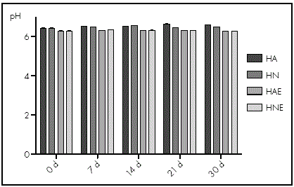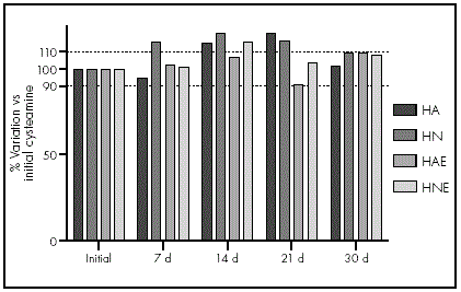 The formulas were divided into 2 batches: those without preservatives and those with preservatives. The latter batches were prepared by adding 0.01% Ethylene Diamine Tetraacetic Acid (EDTA) while dissolving the cysteamine. Half of the batches with and without preservatives were stored for 30 days at 22 ºC (room temperature) and the other batches were stored at 4 ºC (refrigerated). In the rest of this article, these formulations are referred to as HA (room temperature without EDTA), HAE (room temperature with EDTA), HN (refrigerated without EDTA), and HNE (refrigerated with EDTA).