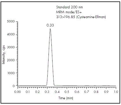 A narrow, symmetrical, and well-defined chromatographic peak was obtained with an elution time of 0.33 minutes. Figure 5 shows an example chromatogram of the derivatised cysteamine obtained using the UPLC-MS/ MS method.
