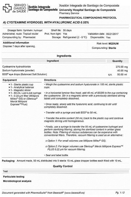 Los parámetros físicos y químicos evaluados han sido la osmolalidad, el pH y la concentración de cisteamina, siendo esta última valorada mediante un método de cromatografía líquida de ultra alta presión, empleando un detector de masas en tándem (UPLC-MS/MS). Los ensayos descriptivos se han basado en la medición de la transparencia y los ensayos microbiológicos en la realización de pruebas de esterilidad.