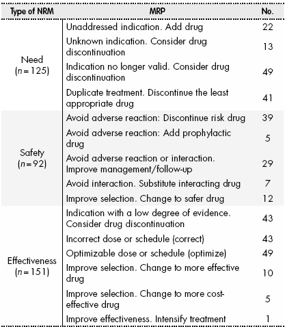 Based on the type of negative results associated with medication (NRMs), the MRPs detected were classified into: need, safety, and effectiveness7.
