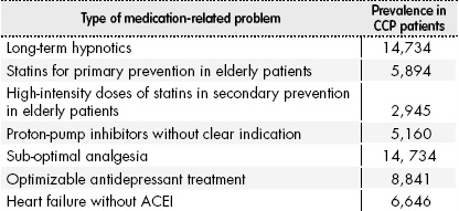 Results: 85 patients were reviewed, and 368 potential medication-related problems were identified. The areas with the most prevalent medication-related problems were the long-term use of hypnotics, sub-optimal analgesia, optimizable antidepressant treatment, statins in patients older than 75 years in primary prevention and in those with high-intensity doses in secondary prevention, patients with heart failure without angiotensin-converting enzyme inhibitors, and proton-pump inhibitors without indication.