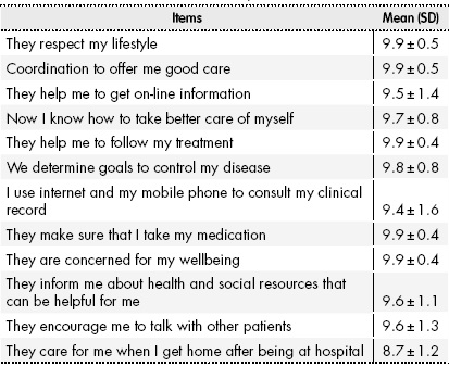 Resultados:  Se incluyeron 91 pacientes. La puntuación media global obtenida fue: 9,7 ± 0,3. Los ítems que obtuvieron puntuaciones más elevadas fueron: respetan mi estilo de vida (9,9 ± 0,5); se coordinan para ofrecerme una buena atención (9,9 ± 0,5); me ayudan a seguir el tratamiento (9,9 ± 0,4); se aseguran de que tomo la medicación (9,9 ± 0,4); se preocupan por mi bienestar (9,9 ± 0,4). Los puntos con posibilidades de mejora incluyeron: se preocupan por mí al llegar a casa tras el ingreso hospitalario (8,7 ± 1,2).