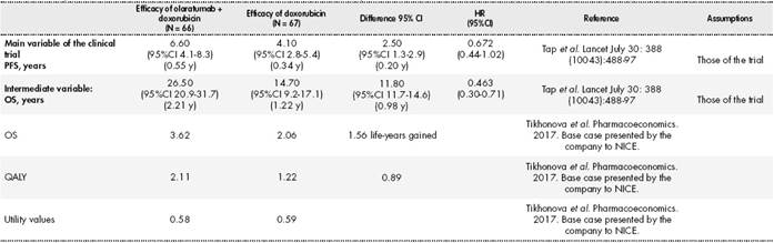 For the purposes of the economic assessment, on November 11, 2017, a literature search was conducted of Medline-Pubmed using the descriptors “olaratumab” AND “incremental cost-effectiveness”. An article published in 2017 by Tikhonova et al.14 was obtained.