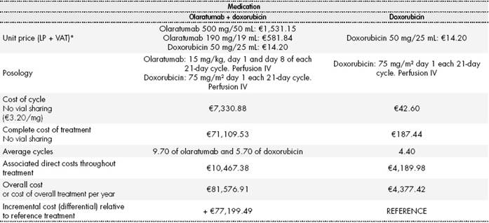 Olaratumab was authorized for marketing in Spain on November 1, 2017. Its price was consulted in BOT PLUS15. The deduction described in Royal Decree Law (RDL) 8/201016 was applied as well as 4% VAT. Thus, the economic assessment was conducted using the following prices: The notified list prices of €1,531.15 and €581.84 for 500 mg/50 mL and 190 mg/19 mL vials of olaratumab, respectively. The list price of €14.20 for 50 mg/25 mL doxorubicin.