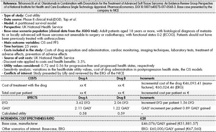 Conclusions:  Olaratumab is a drug that provides a significant benefit in overall survival but not in progression free survival. To be used in soft tissue sarcoma and to be cost-effective, the acquisition cost of the 500 mg vial should be between €101.91 and €506.54 and that of the 190 mg vial between €39.31 and €195.37.