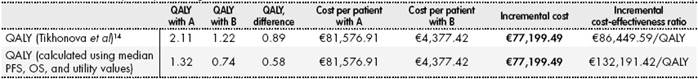 If we use the QALYs calculated with the median PFS, OS, and the utility values of 0.72 for PFS and 0.56 for OS reported by Reichardt et al.18, each additional QALY would cost €132,198.11/QALY.