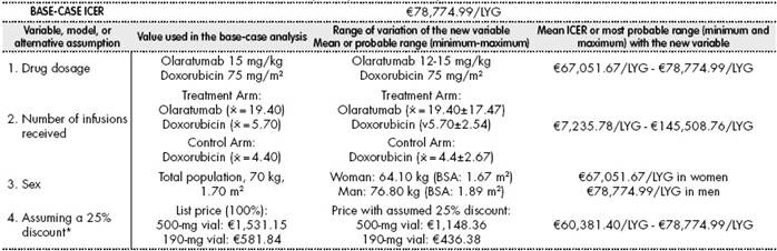 ANALYSIS 1: We decided to perform a sensitivity analysis, because olaratumab can cause grade 3 adverse reactions at the gastrointestinal and musculoskeletal level, in addition to those that originate at the haematological level, and in these cases the dose of olaratumab should be discontinued until toxicity is less than or equal to grade 1 or has returned to baseline level prior to treatment. In subsequent infusions, the dose should be reduced to 12 mg/kg in the case of severe (grade 3) toxicities. Therefore, we conducted a sensitivity analysis with doses of 12 mg/kg olaratumab. We did not include a dose reduction in the case of doxorubicin. The maximum ICER was estimated taking into account the costs of neutropenia, mucositis, and so on. The ICER was estimated to be between €67,051.67/LYG and €78,774.99/ LYG (base-case ICER).