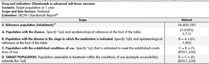 According to the INE19, as of January 1, 2017, the Spanish population was 46,528,966 and the Spanish population equal to or more than 18 years was 38,400,583. We estimate that in Spain there would be 1,800 patients with metastatic STS per year. If we take into account restrictions of age, morbidity, and indication (i.e. mainly cardiac toxicity caused by doxorubicin), there would be between 800 and 1,200 candidates per year for the administration of olaratumab. If we assume an incidence of 8 cases of STS per 100,000 population per year, metastasis would occur in 20% of cases and there would be a risk of recurrence in 35% of cases20.
