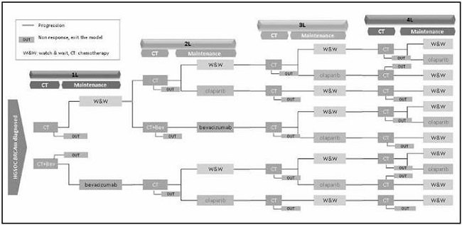 Because the clinical trials of bevacizumab and olaparib showed no statistically significant differences in OS versus the comparator, a single OS curve was developed for each line, regardless of the maintenance treatment administered.