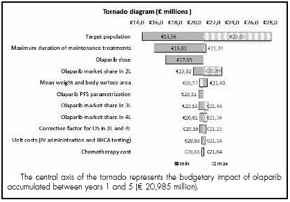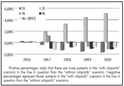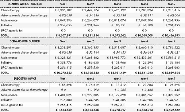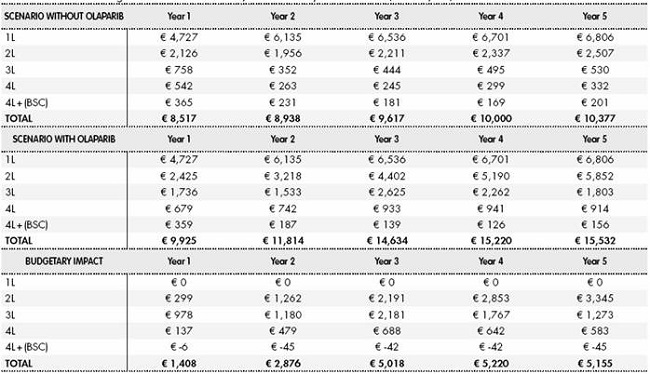 Results: The use of olaparib meant that, after 5 years, 6% fewer patients progressed to later lines compared to scenario without olaparib, remaining longer in the second line and delaying the initiation of subsequent lines. The total estimated budgetary impact ranged between € 1.6 and € 5.4 million (1-5 years). The economic impact associated to the introduction of olaparib is partially offset by the lower cost of chemotherapy, related adverse events, and palliative care in patients with olaparib than in patients without it.