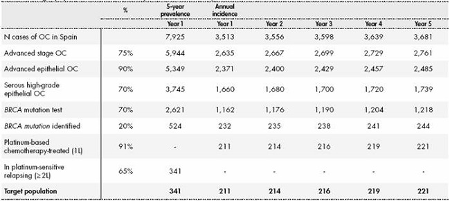 Conclusiones: Olaparib como tratamiento de mantenimiento en pacientes con cáncer de ovario seroso de alto grado y mutación del gen BRCA aumenta la supervivencia libre de progresión y retrasa la utilización de quimioterapia posteriores, con un impacto presupuestario para el Sistema Nacional de Salud de 5,4 millones de euros tras 5 años.
