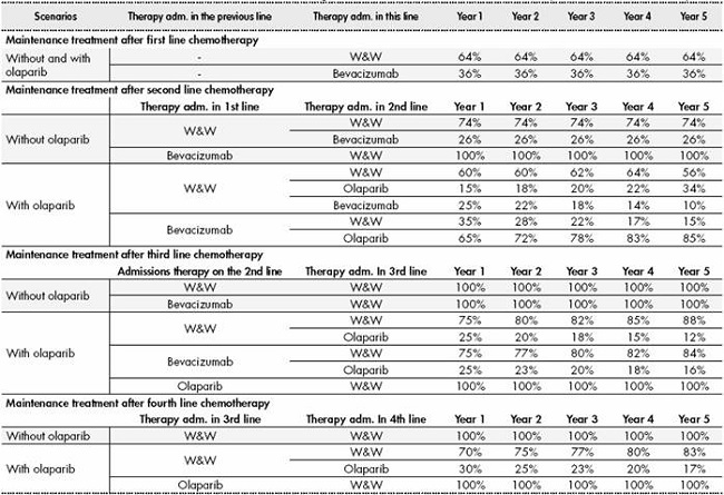 Therefore, the present analysis is the first to determine the economic impact of the introduction of olaparib as maintenance therapy in different OC treatment lines. In addition, by modelling the patient flow between successive treatment lines based on the PFS and OS, the analysis allows to estimate the proportion of women who might benefit from receiving effective maintenance therapies in the short term, delaying subsequent lines of chemotherapy.