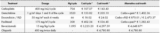 The duration of treatment considered was 4.5 months (6 cycles) for doublet chemotherapy and until progression (according to PFS) for maintenance treatments (bevacizumab or olaparib). In the case of palliative treatment, a cost of € 838.71€ was considered for the 5 months prior to death19.