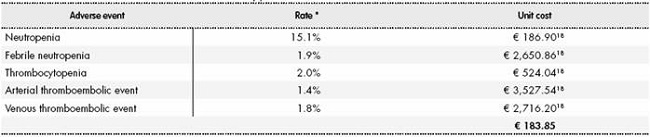 The cost of AE due to chemotherapy (with a frequency > 1% in the ICON7 study20) was calculated as the weighted mean of the unit cost of each event18 and the percentage of patients who experienced it during the study. The weighted cost attributed to AE due to chemotherapy was € 183.85 (Table S5) (Supplementary Material).