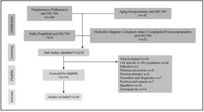 Inclusion criteria were: all English-or Spanish-language original or review articles published between 2007 and 2017 which analysed the management of aging and medication regimen complexity in HIV-positive patients older than 50 years.