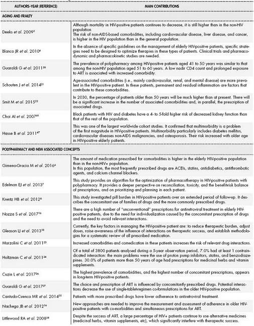Results: A total of 208 references were analysed, including, finally, only 68. An aging of the population and an increase in associated comorbidities have been identified, especially over 50 years-old. Immunological changes similar to those that are generated in a non-infected elderly population have been described. These conditions influencing the prescription of antiretroviral treatment, according to studies identified. In parallel, polypharmacy is increasingly present, being defined exclusively by the concomitant use of five drugs. Pharmacotherapeutic complexity, through the Medication Regimen Complexity Index, has begun to analyse and relate to health outcomes. There has been a need to know and apply concepts already known in non-HIV-aged population, such as deprescription, potentially inappropriate medication, cholinergic risk, although few results are available.