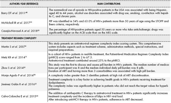 Conclusions: There is a growing interest to know about the relationship between HIV and aging. Pharmacotherapeutic complexity is beginning to be used as a pharmacotherapeutic follow-up criterion due to its influence on health outcomes. It is necessary to manage and incorporate new concepts that help pharmacotherapeutic optimization in this population