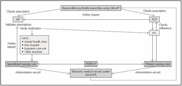 In the MHUs, the patient is given an appointment with a member of the nursing staff, who is in charge of ordering the treatment of each patient from the hospital pharmacist each month using calendar-like speadsheets. In the HC, the PC pharmacist reviews and coordinates patient treatment and orders the antipsychotics every month from the hospital pharmacist, who sends them directly to the HC.