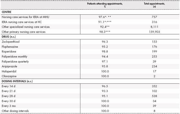 Results: A total of 919 patients and 1,073 appointments were included. Eleven mental health units and 40 primary health care centers participated in data collection. In 95.7 % (1,027) of cases, the patients attended the appointment. No differences were found in adherence between drugs or administration frequency. However, differences were found between mental health units and primary health care centers. Patient adherence was slightly higher in mental health units (97.6% vs 91.1%; P < 0.001).