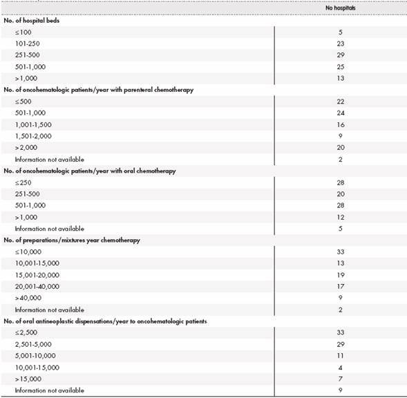 Hospital characteristics are shown in Table 1. Taking the central value of each interval as reference, set for number of patients seen with parenteral and oral chemotherapy in each hospital, it was estimated that the annual POH average was 1,201 ± 825 and 568 ± 450 respectively, ie 1,769 patients/year as a global average per hospital.