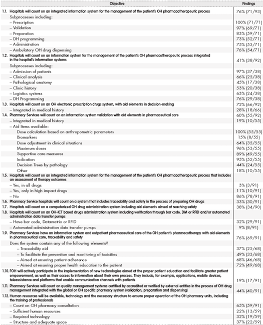 The results of the organizational development strategic line are shown in Table 2. Note that 76% of hospitals stated to have a management information system for the pharmacotherapeutic process that went from prescription to administration or outpatient dispensing of OH drugs. Only 3% of hospitals were performing outcome assessment through an integrated information management system of all drugs. This percentage increased to 11% if this follow up was done exclusively for high-impact treatments.