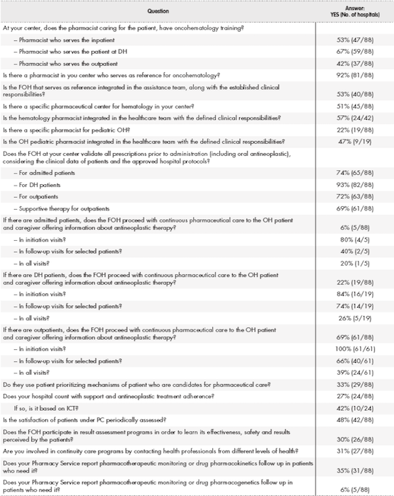 Results: A total of 95 hospitals responded to the survey. Out of which, 76% had an integrated information system of pharmacotherapeutic process management, where a variability in technological and organizational processes were found. The oncohematological pharmacist led the implementation of the principles of medicine, based on evidence and results obtained in routine clinical practice. It was shown that 88% of hospitals had standardized protocols. As for safety practices, in 83% of hospitals, oncohematological pharmacists actively participated in the development and maintenance of risk management program, implemented to prevent errors. Preparation was centralized in 89% of hospitals. Variability was observed in pharmaceutical care depending on where the patient was attended. In 92% of hospitals, pharmacists served as reference for Oncohematology, although with different levels of training. Major deficiencies were observed in training programs and teaching. Of all oncohematological pharmacists, 53% had been a researcher over the past three years.