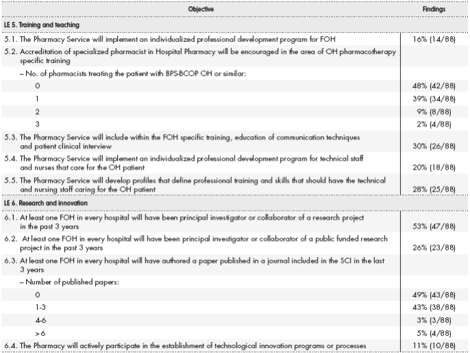 Regarding the strategic line 4 of pharmaceutical care in SOPU, the survey results are shown in Table 3. It should be emphasized that 42- 67% of hospitals had a pharmacist with OH training, while in 53%, FOH was integrated into the support teams with defined responsibilities, and 92% had an OH pharmacist as reference.