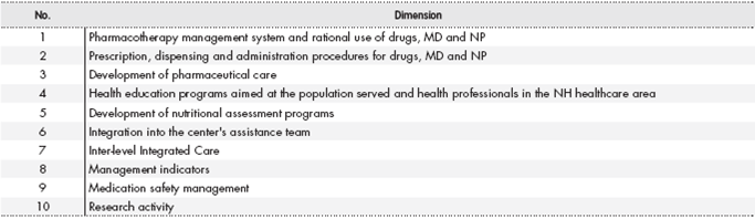 Method: Observational, cross-sectional, multicenter study conducted between February-June 2018 through a survey aimed at all Hospital Pharmacy Units in Spain. Once the initial version was assessed by twelve evaluators whose healthcare assistance work were related to nursing homes, an electronic form was designed, consisting on 10 dimensions and 66 questions. A piloting was carried out by six nursing homes pharmacists. The results were analyzed descriptively.