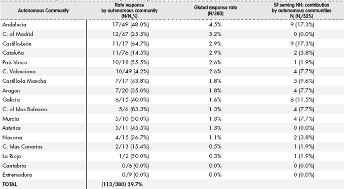 Of the 380 SF consulted, 113 responses were received, from 15 different CCAA, resulting in an overall response rate of 29.7%. Out of all of them, 52 (46.0%) SF provided services in NH. The response rate was not homogeneous among CCAA. No response was obtained in 2 Autonomous Communities. There was a greater contribution of SF serving at NH in Castilla-León, Andalucía and Galicia (Table 2).
