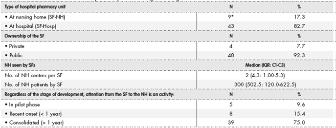 Results: The overall response rate was 29.7% (113 out of 380). Out of all studied hospital pharmacy units, 46.0% (n = 52) served nursing homes (9 as Nursing Homes Pharmacy Department) whose characteristics defined a profile of pharmacy unit at hospital, public ownership, consolidation in this activity, with great variability in the number of centers and patients to be attended by service, and with the pharmacist’s partial dedication. In 51.3% of cases, nursing homes professionals were represented at pharmacy and therapeutic committees, while 38.5% were from pharmacy services who participated in the selection of medical devices. Also, 67.4% performed an integral management of the therapy. The study has also shown that 34.6% counted on assisted electronic prescription, while 88.5% performed a pharmaceutical validation of the prescription prior to dispensing, which in 71.2% of cases consisted of individualized unit doses. It was found that 42.3% performed a third-level treatment comprehensive review, and 25.0% participated in the interdisciplinary nutritional assessment. It also showed that 34.6% actively participated in either comprehensive geriatric assessment, or clinical cases in interdisciplinary teams, and 46.2% counted on programs for the safe use of medicines.