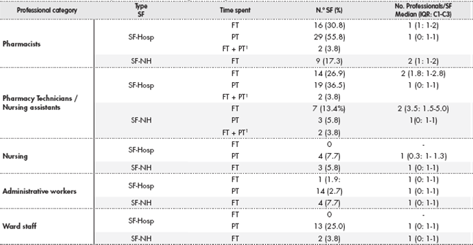The characteristics of the SF serving at NH are shown in Table 3 and different SF professionals involved in this activity are shown in Table 4. Some SF included primary care pharmacists and other professionals, such as dietitians. The presence of nursing was low (13.4%, n = 7). The dedication of the specialist pharmacist to NH care was partial in more than 50% out of the SF.