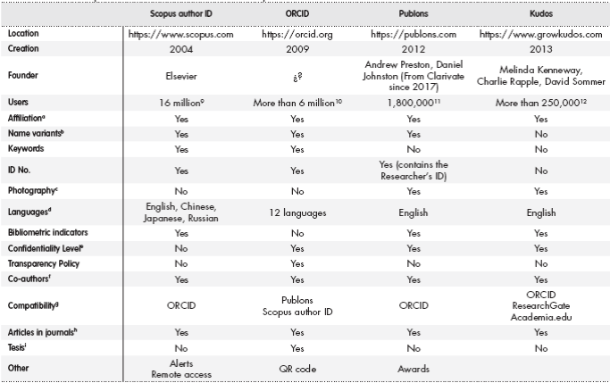 All four online platforms have an unequivocal website per researcher and an identification number (except Kudos). Also all (except Kudos) offer the possibility of having a list of the researcher’s variant names. This is an advantage in countries such as Spain, where compound names are common and have two last names. All offer the possibility of associating the research profile with the different co-authors of the published works.