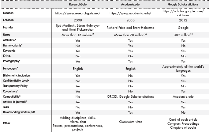 Displaying each user’s associated affiliation, incorporating articles from journals in their profiles and including a list of keywords based on the research line are the common characteristics of these three social research networks. None of the social research networks assign an identifier to each profile. This entails a limitation regarding platforms that do have it incorporated, since authors with similar names and/or surnames can be found, resulting in causing confusion on certain occasions.
