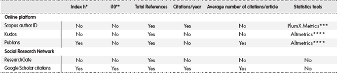 All online platforms have different bibliometric indicators, with the exception of ORCID (Table 3). These indicators are quantitative and qualitative tools that allow us, in theory, to know the importance of a written scientific production, by either an author, a group or an institution20,21.