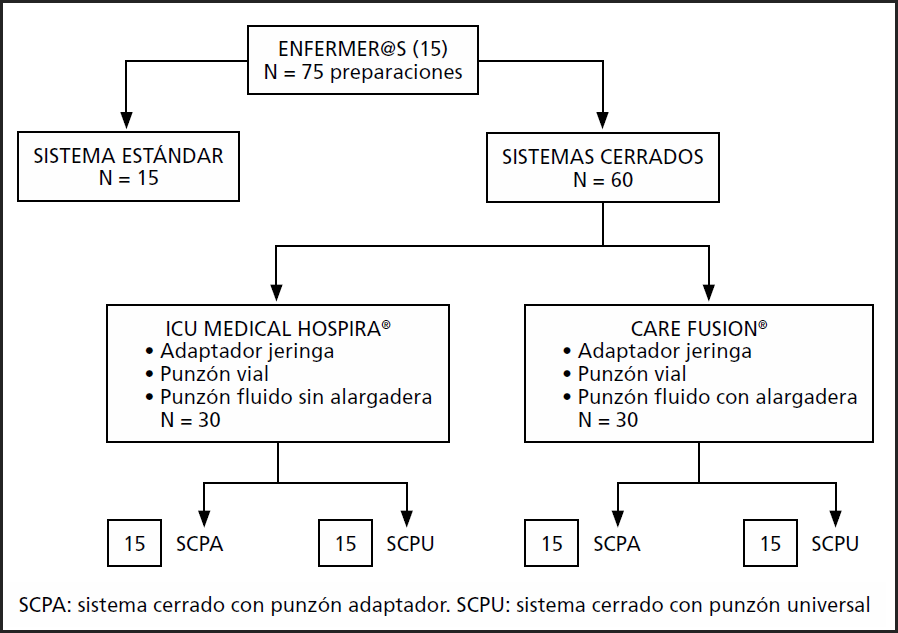 15 enfermeros del Servicio de Farmacia fueron invitados a participar en el estudio. Cada uno de ellos elaboró un total de 5 preparaciones consecutivas, una preparación siguiendo el procedimiento estándar establecido en el hospital y cuatro preparaciones usando los sistemas cerrados Care Fusion® e Icu Medical® (dos con cada SC: una con el punzón universal y otra con el punzón adaptador) como se muestra en la figura 1. Todos los enfermeros fueron instruidos para realizar los mismos movimientos y usar la misma técnica, y así minimizar las diferencias entre ellos.