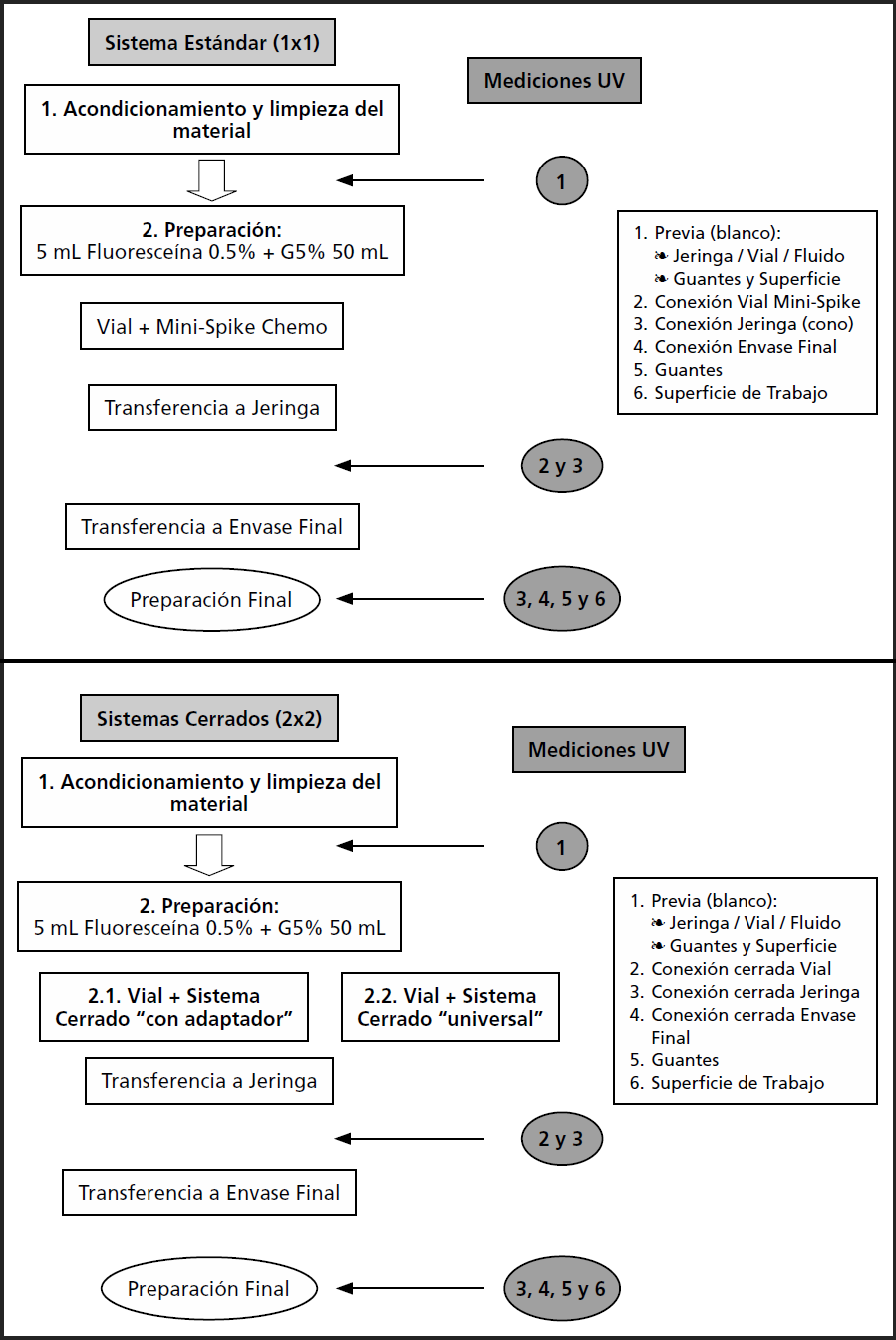En el estudio se compararon dos proveedores distintos de sistemas cerrados, Icu Medical® y Care Fusion®, frente al sistema estándar de preparación de quimioterapia parenteral. El sistema estándar es un sistema abierto compuesto por jeringas, y filtros Mini-Spyke®. Los filtros Mini-Spyke® son filtros de venteo de membrana hidrófoba (diámetro medio de poro de 0,22 mcm) para evitar la sobrepresión en el interior del vial y por tanto la formación de aerosoles. Los sistemas cerrados, Care Fusion® e Icu Medical®, estaban compuestos: