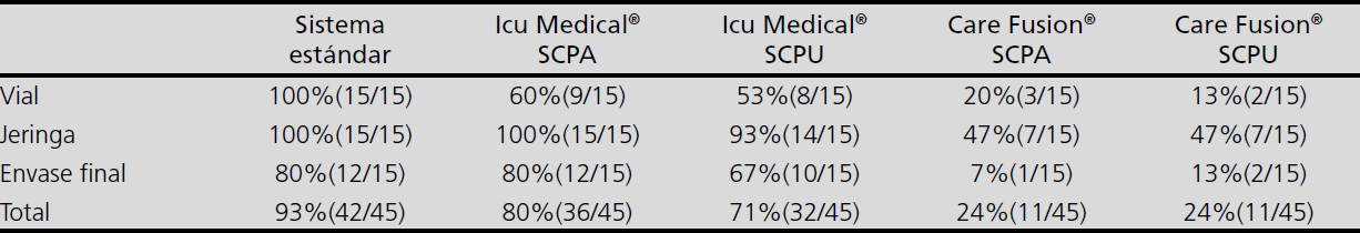 Resultados: se elaboraron 75 preparaciones. Se produjo una reducción global de la contaminación local para los SC Icu Medical® y Care Fusion® del 24% y 74%, respectivamente. En el sistema cerrado Care Fusion® la contaminación local fue significativamente menor que en el sistema estándar en vial, jeringa y envase final; mientras que en el sistema cerrado Icu Medical® solo fue significativamente menor en la conexión al vial. Se produjo un incremento significativo del tiempo de preparación con la utilización de sistemas cerrados de los entre 23,4 y 30,5 segundos.