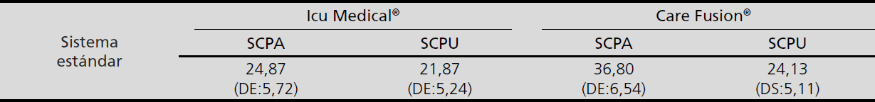 En cuanto a los tiempos de preparación como se observa en la tabla 2, cuando la preparación se realizó utilizando los sistemas cerrados se produjo un incremento significativo del tiempo de preparación con respecto al tiempo empleado en la preparación estándar. Se emplearon un mínimo de 21,87 (DE: 5,24) segundos más cuando se utilizó el SCPU Icu Medical® y de 24,13 (DE: 5,11) segundos más en el caso del SCPU Care Fusion®, no siendo significativas las diferencias de tiempo entre ambos sistemas cerrados (p>0,05).