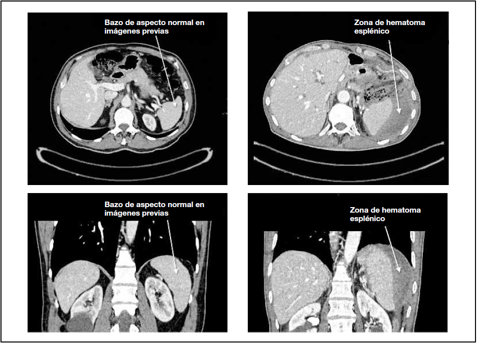 Otras situaciones que pueden originar rotura esplénica espontánea son las enfermedades infecciosas (mononucleosis, infección por citomegalovirus VIH, endocarditis, malaria), hematológicas (linfoma no-Hodgkin, leucemia linfoblástica aguda), tumorales (angiosarcoma, coriocarcinoma), enfermedades inflamatorias de causa no infecciosa (pancreatitis o amiloidosis primaria) e incluso relacionadas con el embarazo4.