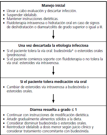 En base a las recomendaciones de un panel de expertos sobre los efectos adversos relacionados con el idelalisib (Fig. 1), en casos graves (siete o más deposiciones al día) o que requieran una hospitalización por razón de la reacción adversa, se recomienda interrumpir la administración de idelalisib, monitorizar al paciente durante una