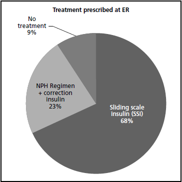 Results: 78 patients were included. At admission to the Emer- gency Department, treatment was modified for 91% of patients, and omitted for 9%. The most prescribed treatment was sliding scale insulin (68%). The treatments prescribed coincided in a 16.7% with the recommendations by the Spanish Society of Emergency Medicine. After intervention by the Pharmacist, the omission descended to 1.3%, and the adapta- tion to the recommendations increased to 20.5%. Comparing patients whose treatment coincided with the recommendations and those who did not, the clinical impact was respec- tively: mean glycemia at 24 hours: 138.3 ± 49.5 mg/dL versus 182.7 ± 97.1 mg/dL (p= 0.688); mean rescues with insulin lispro:± 1.6 versus 1.5 ± 1.8 (p= 0.293); mean units of insulin lispro administered: 4.6 ± 12.7 IU versus 6.6 ± 11.3 IU (p= 0.155).