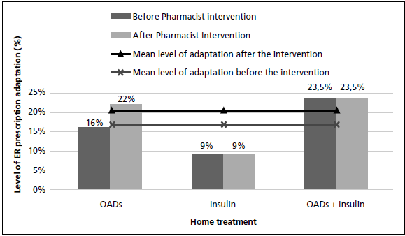 The ER pharmacist had an intervention in those 7 patients who had their hypoglycaemic treatment omitted. There was an 85.7% acceptance of this intervention (6 patients). On the other hand, the Pharmacist recommended dose adjustment for NPH insulin in two patients, and this was accepted. The mean time for error resolution was 21.1 ± 12.8 hours. The percentage of patients with antidiabetic treatment omissions went from 9% to 1.3% after the Pharmacist intervention, though adaptation to protocol only improved in 3 patients: from the 16.7% of adaptation in prescriptions by ER specialists to 20.5% after the intervention of the ER pharmacist. Figure 3 shows the level of adaptation to the protocol by the SEMES based on home treatment, before and after the Pharmacist intervention.