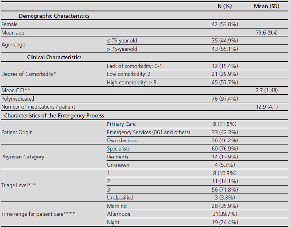 The population of the study was finally formed by 78 patients in total (out of the 132 with reconciled medication), who had been previously diagnosed with diabetes mellitus (97.4% Type 2 diabetes). The mean age was 73.6 ± 9.4, with 55.1% patients over 75year-of age. Out of these patients, 53.8% were women, and 57.7% presented a Charlson Comorbidity Index (CCI) equal or superior to 3, classified as high comorbidity. The most frequent comorbidity was chronic renal impairment (69.2%), followed by heart failure (39.7%) and chronic pulmonary disease (33.3%). The most frequent diagnoses at admission were associated with the cardiovascular (41%) and the respiratory system (32%). Table 1 shows the main characteristics of the population studied, as well of the Emergency process for these patients.