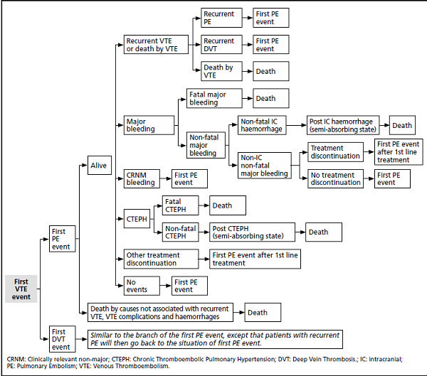 The model considers the risk of developing the following clinical events: recurrent VTE and VTE-related death, major bleeding, clinically relevant non-major bleeding (CRNM), PTS and CTEPH (Table 1). In each cycle, each patient could only present one event.