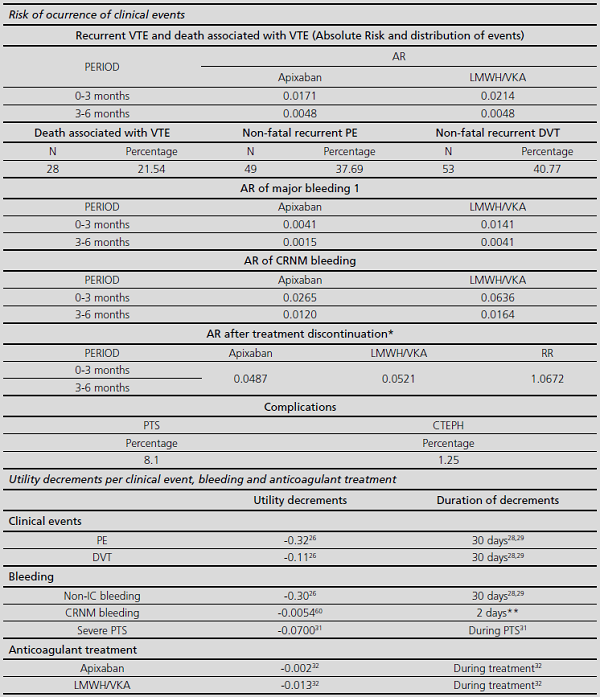 The risk of developing some event was divided into 2 periods: one initial acute phase of 6 months (sub-divided into 0-3 and 3-6 months), which shows the outcomes observed in the direct comparison study between the alternative options (AMPLIFY study)11 and a subsequent period until reaching the time horizon of the analysis, the entire life of the patient. The risk of suffering an event after permanent treatment discontinuation (by withdrawal or completing treatment) was obtained from literature18,19 and from the extension study arm (AMPLIFY-EXT), where placebo was used as comparator20. The frequency of CTEPH (1,25%)21 and the prevalence of PTS (8.1%)22, which was considered constant, were obtained from scientific literature.