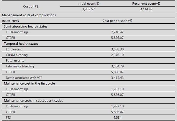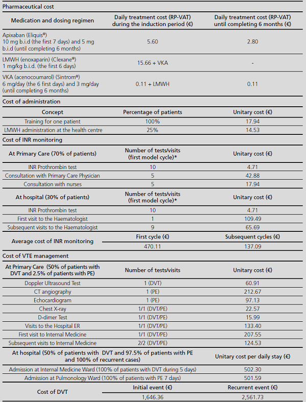 In line with the analysis perspective, only direct healthcare costs were included (pharmaceutical costs, administration, INR monitoring, and management of VTE and its complications). Non-healthcare or indirect costs were not included. The cost of pharmaceutical treatments was calculated by retail price33, applying the current deductions as relevant34. The board of experts provided the identification and calculation of the necessary resources (medication, number of consultations required, diagnostic tests, etc.) for treatment monitoring and management of the disease and its complications. Unit costs (Table 2) were obtained from scientific literature and a national database of healthcare costs; in those cases where necessary, the variation of the index of consumer prices until the year of this analysis was implemented35,36,37,38. All costs included in the model were expressed in 2014 euros.