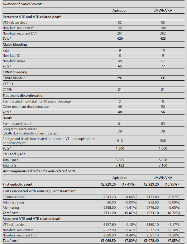The results obtained for a cohort of 1,000 patients and a lifetime horizon revealed that VTE patients treated with apixaban experienced a lower number of recurrent embolic events, major bleedings and CRNM bleeding than those treated with LMWH/VKA. Table 3 shows the number of events, the LYG and QALY, and the costs associated with the anticoagulant therapy and management of clinical events.